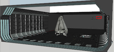 Detail was never the intention with this practice build. I blocked in the notable forms and of course light sources. The Imperial Shuttle (below, red), I grabbed from the SU warehouse so kudos to the person who built it. Highlighted below in yellow is a very large spot light source (I should mention I was using Podium as my rendering software). The green scribbles are omni light sources. Used to light the general area they are placed without a specific direction.